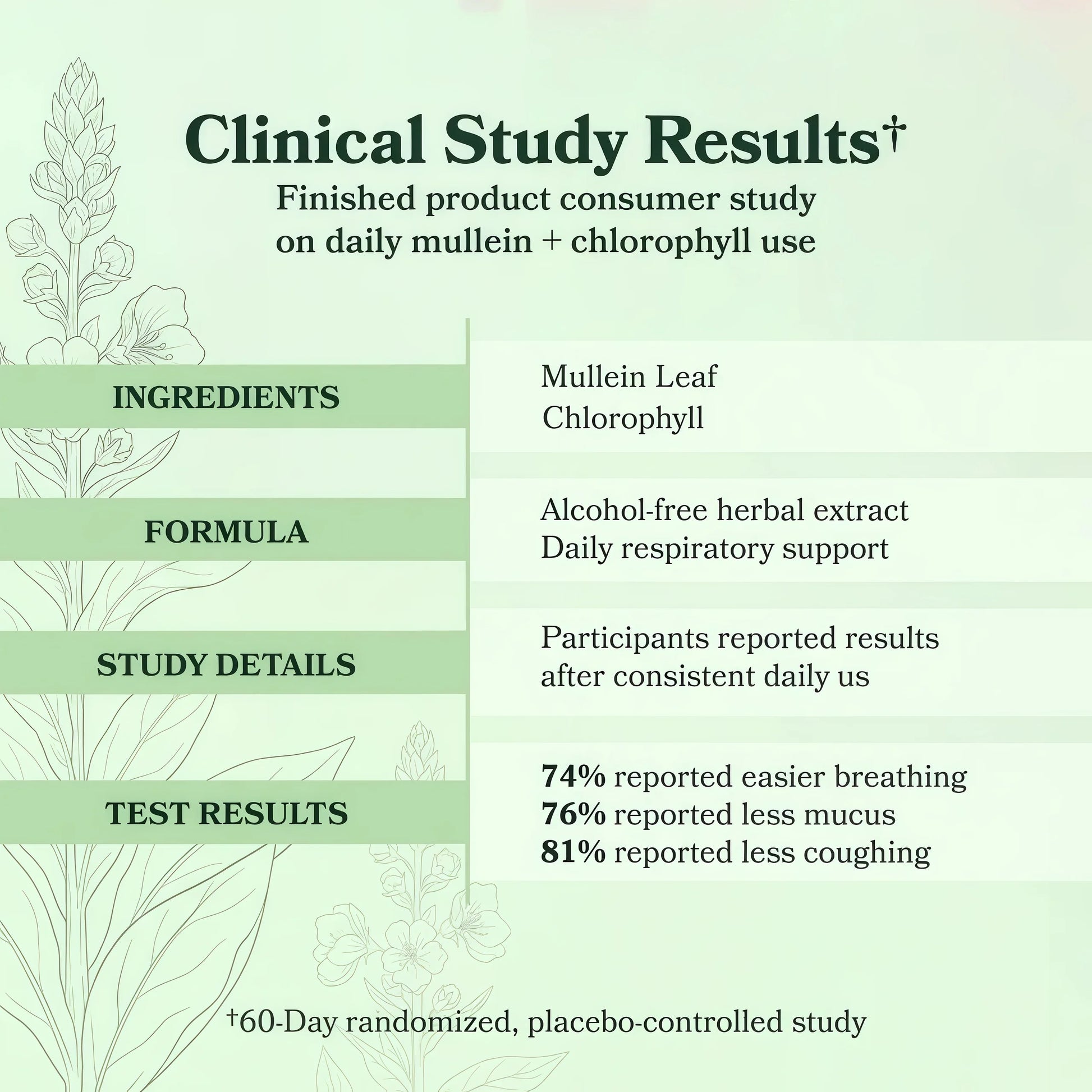 In a 60-day clinical study, participants using our Mullein + Chlorophyll Tincture reported real results: